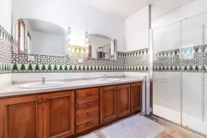 Von der großen, überdachte Außenterrasse führt eine Wendeltreppe zum unteren Wohnbereich, wo sich noch zwei weitere Schlafzimmer mit Ausgang zum Pool und ein Bad befinden.